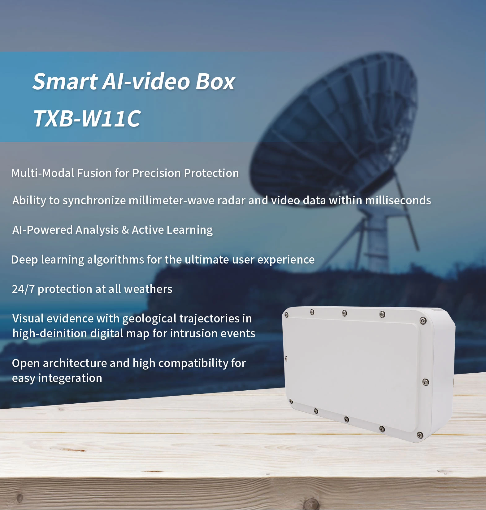 The Smart AI Terminal Box is an edge computing security platform designed to combine input from both radars and cameras. Built in with high-performance heterogeneous computing chip and multi-modal data fusion architecture, it is able to spatiotemporally synchronize radar point clouds and visual data. By seamlessly combining strategic decision making mechanism and area patrol using radar to direct intelligent PTZ camera, it is able to provide the customer with highly reliable perimeter security at all weathers.