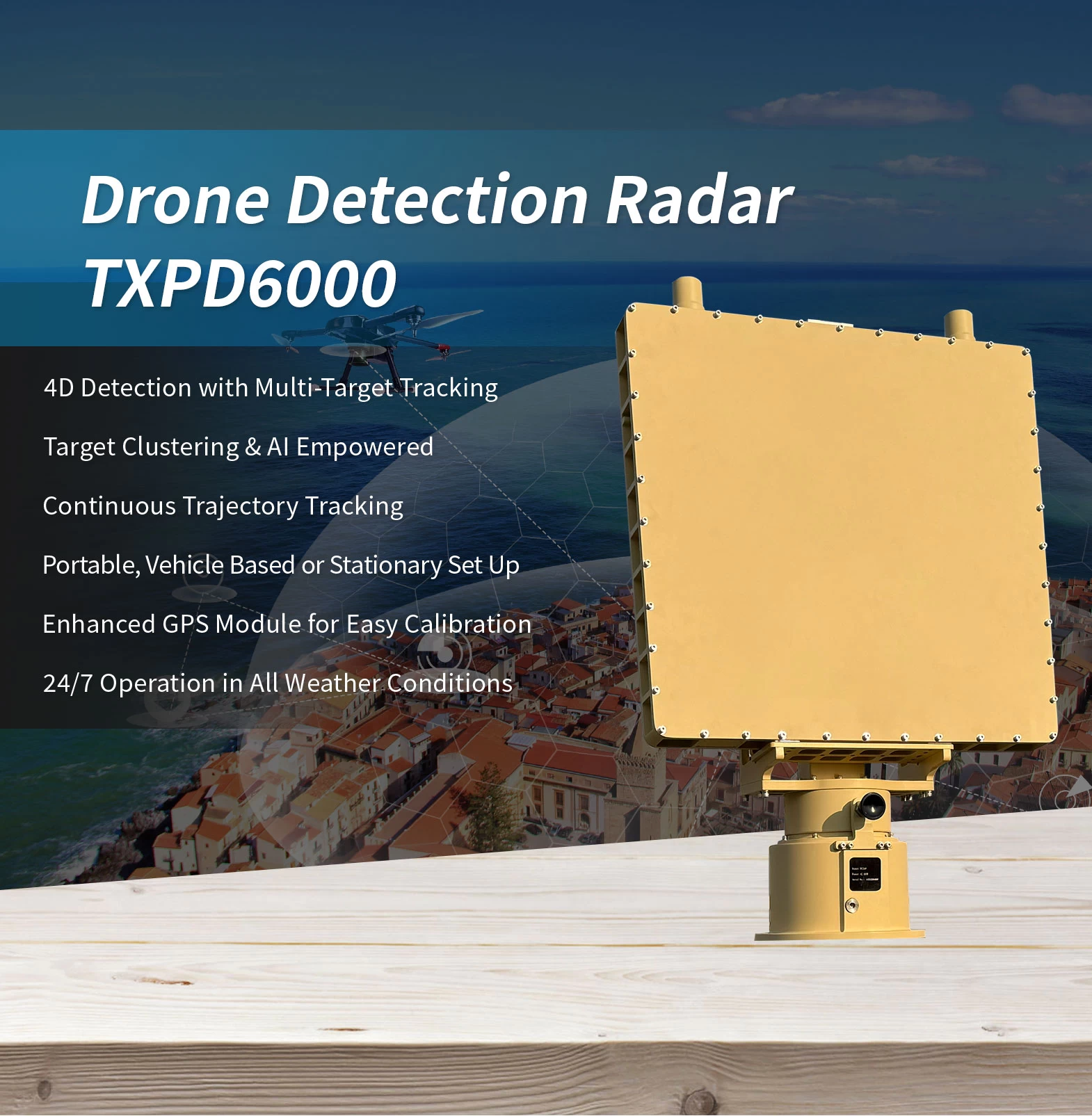 The TXPD6000 drone detection radar is a cost effective 4D DBF radar with superior performance. It detects mini-UAVs up to 6 km in range and has capability to identify up to 100 targets simultaneously. TXPD6000 captures 4D data including range, azimuth, height, and speed. Radar is an essential sensor for anti-drone solution. We highly recommend federal facilities, airports, power plants, oil refineries, borders and stadiums equip TXPD6000 to mitigate drone threats.