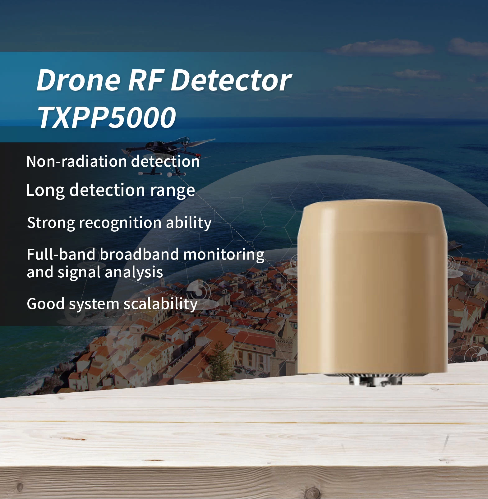 The unmanned aerial vehicle (UAV) Detection equipment can identify common UAV models on the market (including image transmission signals and control signals), detect over 40 Ziele gleichzeitig, and possesses a certain ability to detect UAV remote controllers. The equipment passively intercepts UAV signals, operates 24/7 regardless of weather conditions, emits no high-power electromagnetic radiation, and has a detection range exceeding 5km, with a maximum range of over 10km. Through a browser, real-time access to information such as the UAV’s electronic fingerprint (or serial number), target direction, location, time, frequency, likelihood, target model, and manufacturer is available. It provides a restful API, facili- tating easy integration into other systems.