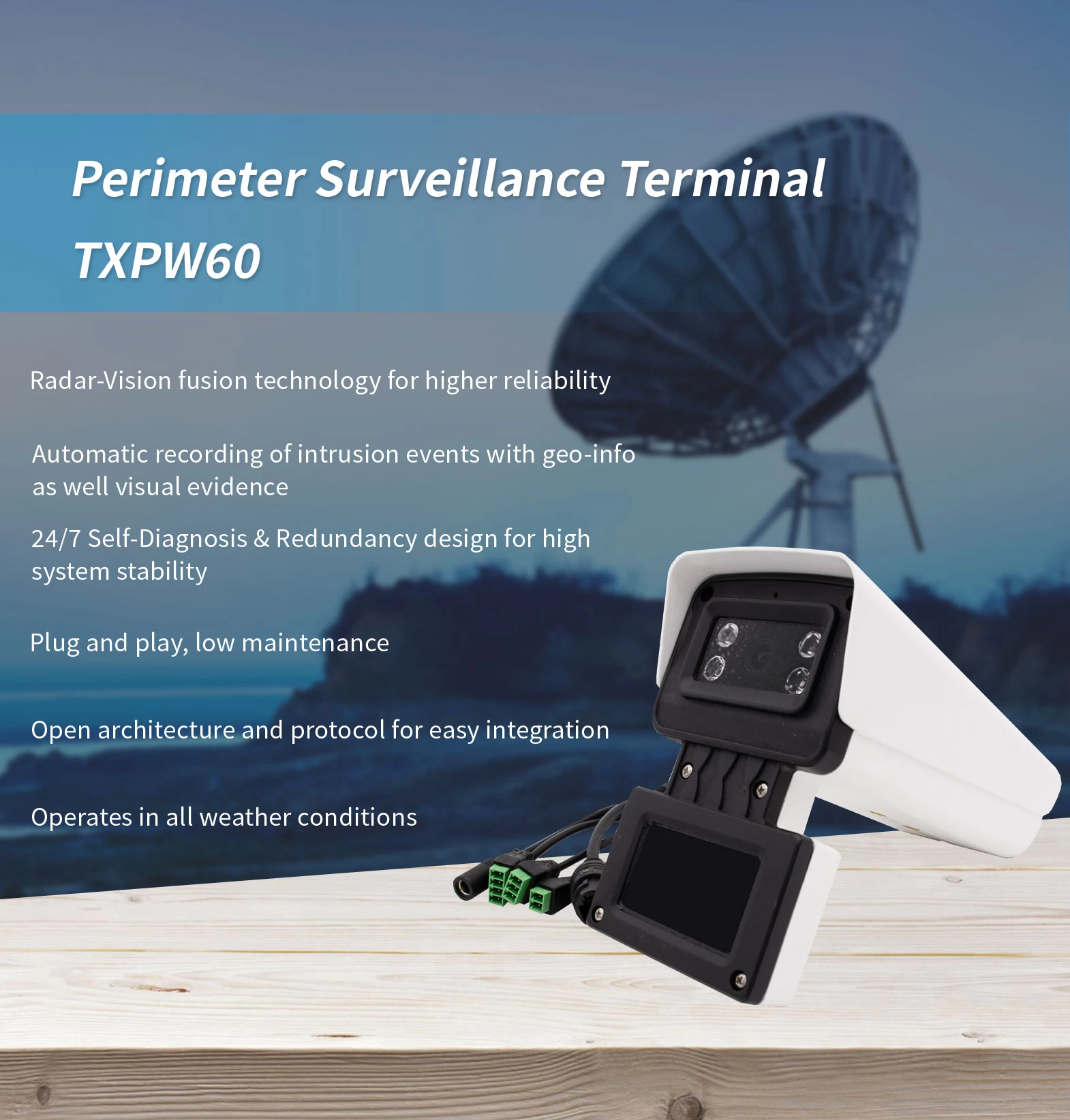 By adding a radar module to the security camera,the security level can be greatly enforced. The radar can work well in the rain, snow, fog, and even in the night, and it can detect the target with the high resolution. So, this radar video integrated terminal can work all the day and night, and make alarm to the back-end on any intrusion.